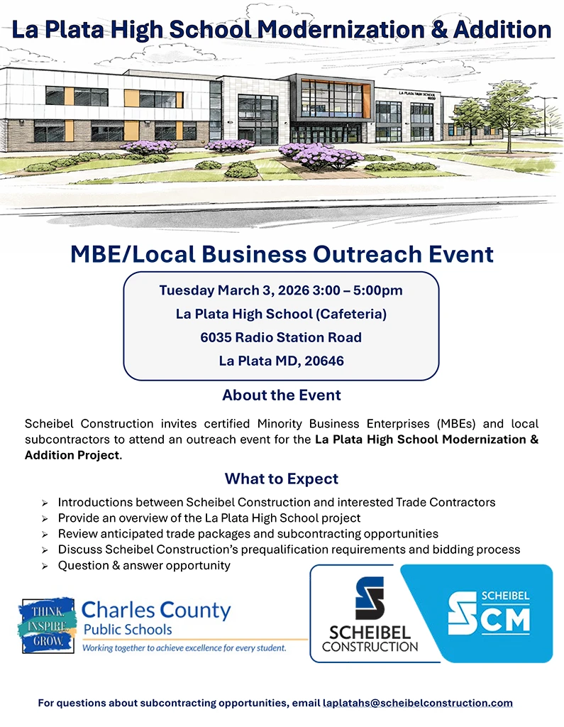 Scheibel Construction invites certified Minority Business Enterprises (MBEs) and local subcontractors to attend an outreach event for the La Plata High School Modernization & Addition Project.